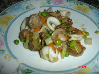 Jantar: Legumes salteados (alho francês, cenoura, ervilhas, cogumelos e xuxu) com lulas